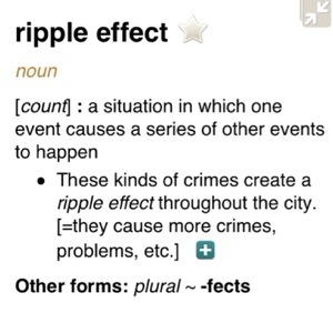 How great Michel! Remember, the ‘ripple effect’ is what happens if you throw a small rock into water, the rings that move outwards are “ripples.” One small ripple turns into a bigger one, then bigger, etc.. So in life, this is used to talk about 1 small action turning into something bigger, then bigger, etc… So what happened after you gave your mother the gift?