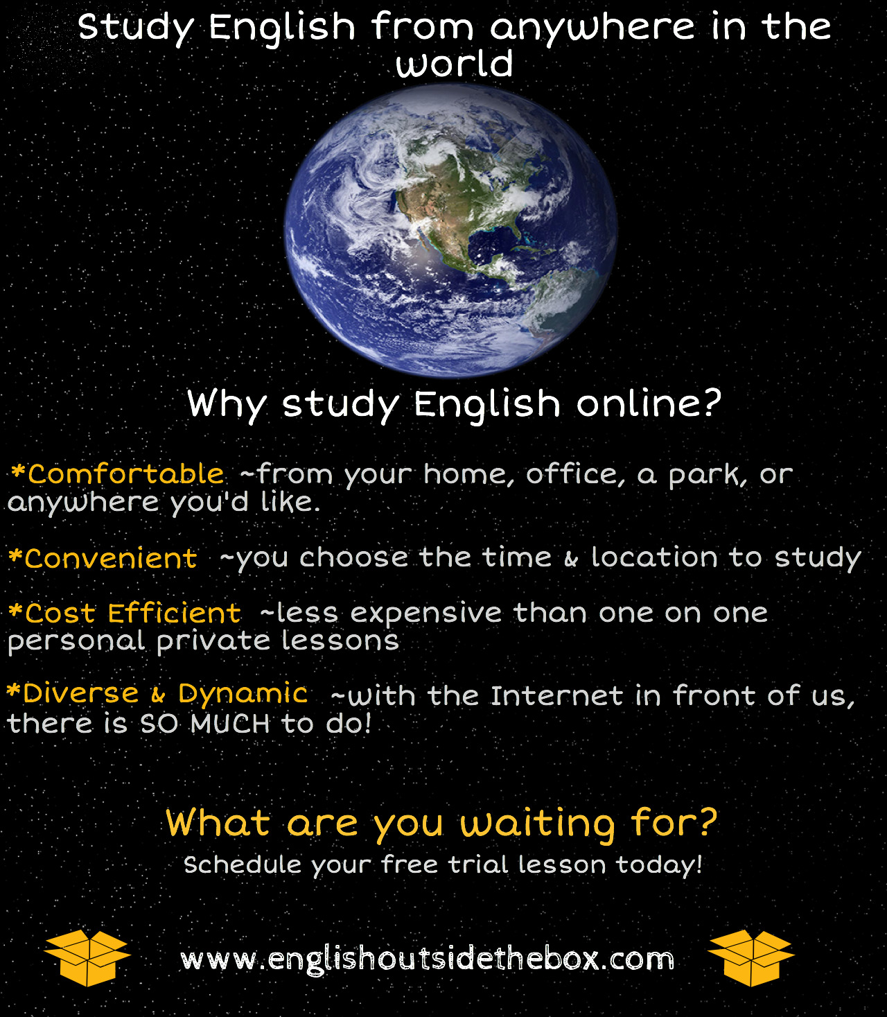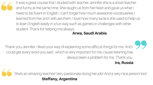 “I don’t have the money for costly one-on-one personal sessions.”• One-to-one/private language sessions can be expensive, especially if you add gas & mileage, materials, and the lesson itself. With online English study, you don’t pay gas/mileage, and I provide the material included in an affordable price. Package pricing is also available when bulk classes are purchased, and make sure to always look for current specials!