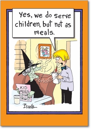3. this is a pun[play on words] with the verb SERVE. The restaurant serves (gives service) to children, while the witch wants to be served children(given children as food).