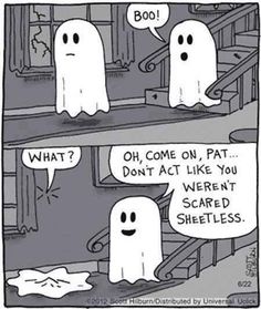 5. to be scared shitless [informal idiom]: to be extremely frightened. Similar to the word “shit” is “sheet” Sheets are commonly represented as a ghost’s attire, so the jokes plays on the similarity of the words shit/sheet.