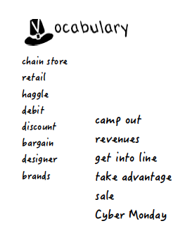I recommend reading the New York times article above for some more information on Black Friday, as well as practicing some more listening with Randall’s ESL-lab here: Shopping Black Friday (http://www.esl-lab.com/shop1/shopping-bf-video.htm)