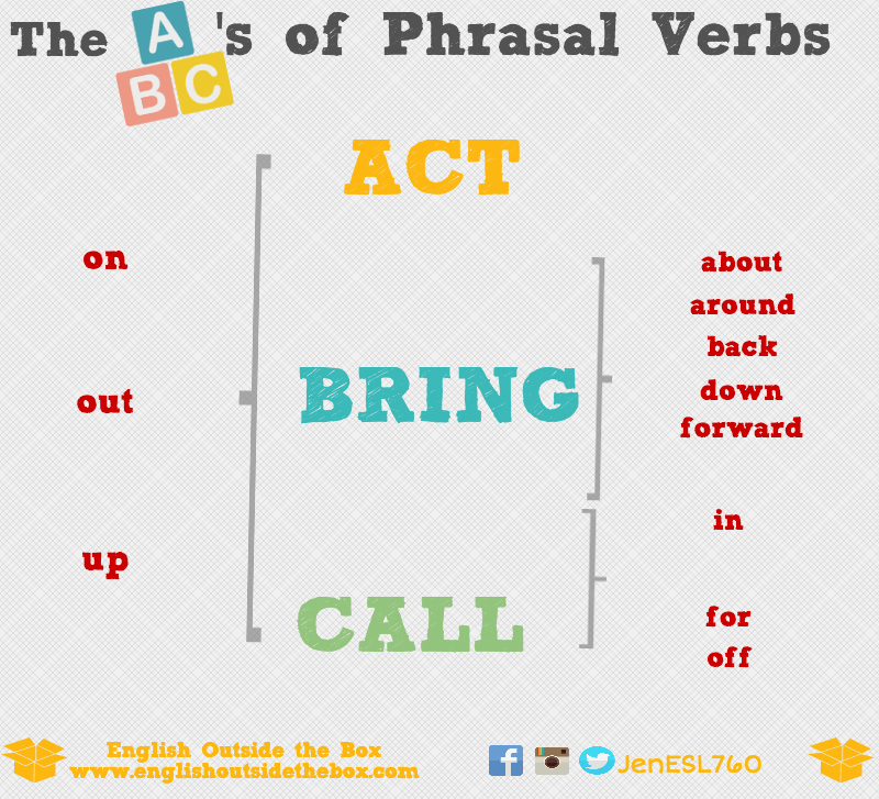 TGIF! Happy Friday! Wherever you are in the world, I hope you have/are having/had a glorious day! Phrasal Verb Friday is back, teaching you the ABC’s and bringing you strategies to make learning even more effective. Remember, long ago, when I told you that a great way to learn phrasal verbs is by focusing on some main verbs and building on the particles. No? Have a quick review here then… There’s even a video of me!