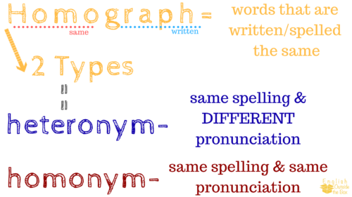 Homograph: a word that is spelled (written) the same as another word (homo: same, graph: written). However, these words have different meanings. Review this type below: