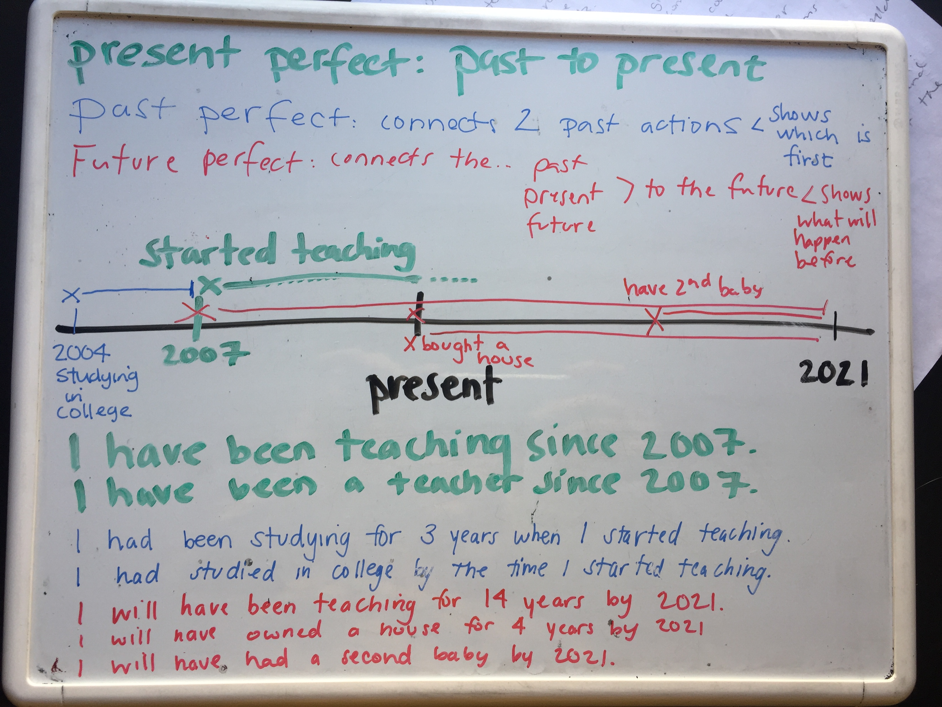 This was the whiteboard used in the video, and for the sentence examples below. Use it a support visual to “see” the connections made with the time tenses