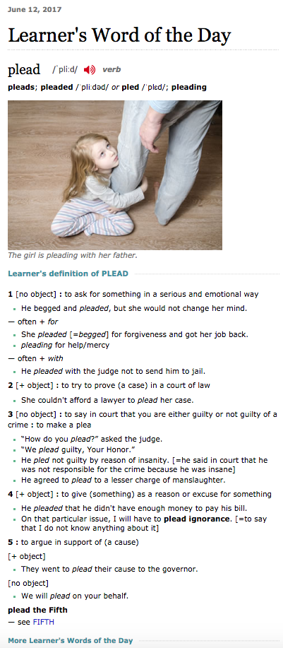 Let’s look at the example of the word above, plead. I want you to think: How can you use this word? In what situations would you naturally talk about “asking for something in a serious and emotional way” You can look at the sample sentences. Have you ever had to plead for a job back? Have you ever pleaded/pled for forgiveness? Have you ever needed someone to change their mind about something important, so you pleaded?