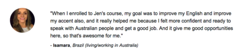 "Jennifer's course is great. It's divided in a way that makes sense and it's easy. Most pronunciations courses are vague and general. This one is specific and it meets my needs. As a Brazilian it's very nice to see someone working with the mistakes I make the most. Totally worthy my time!"